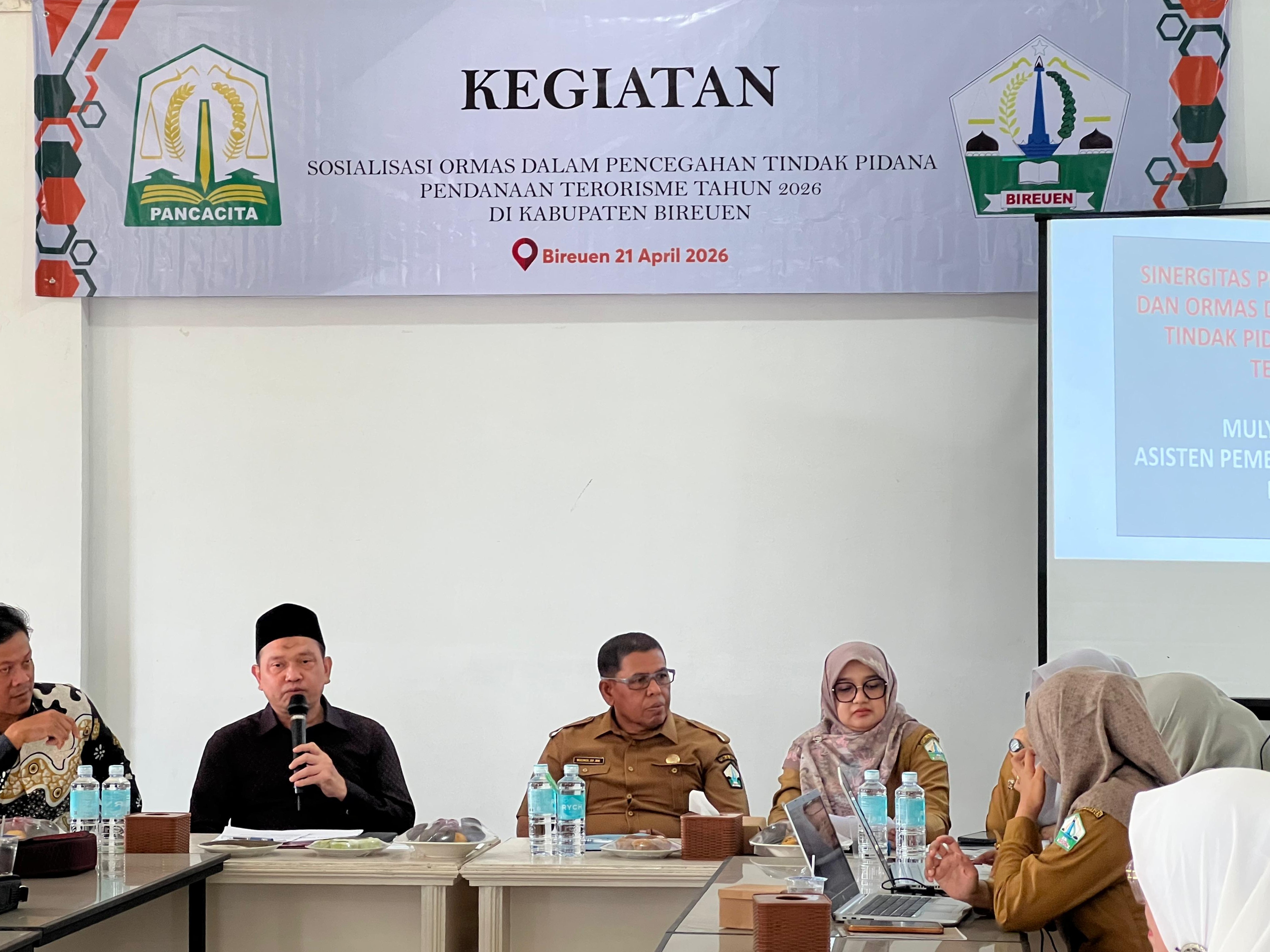 GUMPALANNEWS I Bireuen - Pemerintah Aceh melalui Badan Kesatuan Bangsa dan Politik (Kesbangpol) Aceh menggelar sosialisasi pencegahan tindak pidana pendanaan terorisme kepada organisasi kemasyarakatan (ormas) di Kabupaten Bireuen, Selasa (21/4/2026).